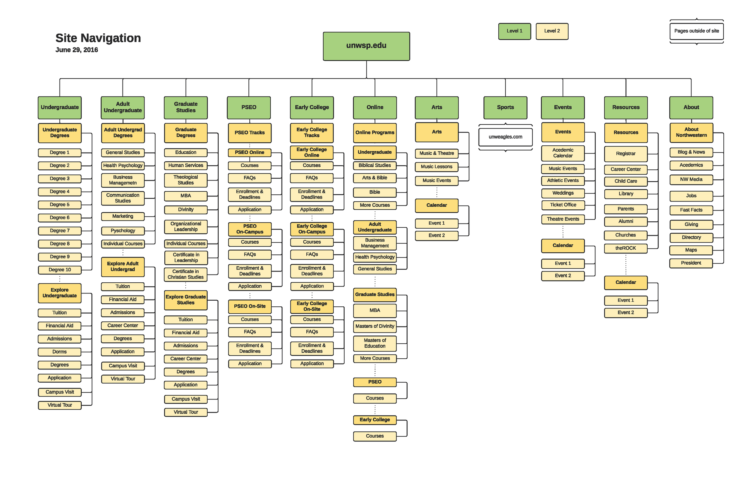 Once these degrees and terms were identified I developed a site map to give an overview of all the new navigational links we were adding to the mega menu. Previously the mega menu had been a single level of navigation. By mapping out the second level this allowed our team to have discussions related to what links were listed and if there were any foreseen issues.